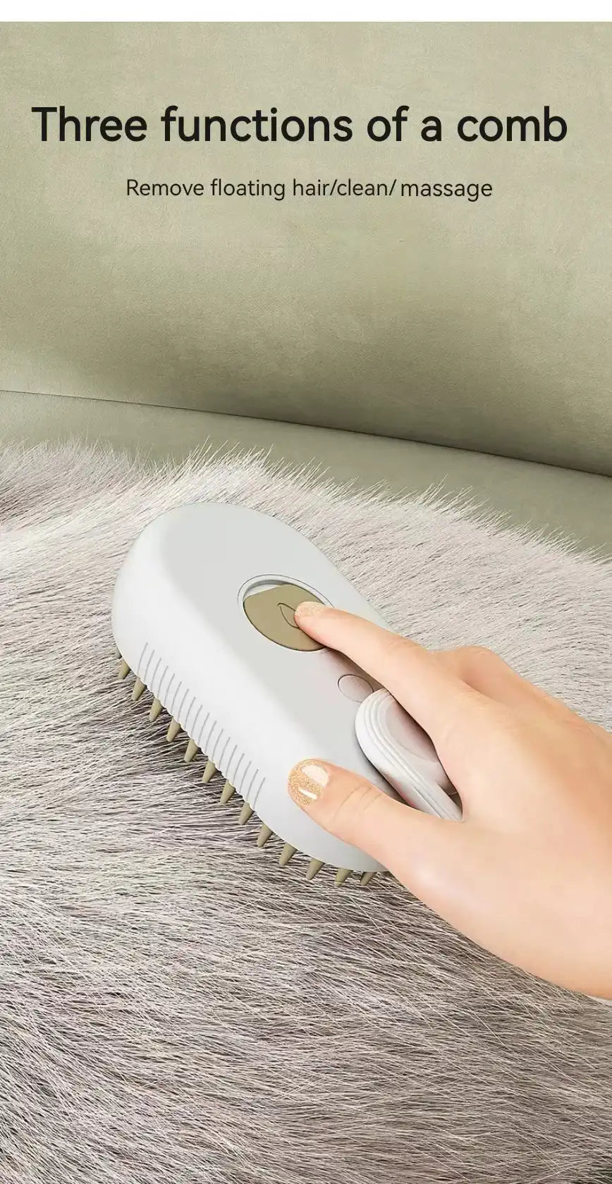 Pet brush with hair removal and steam massage function.